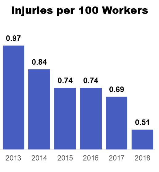 Avient is focused on its goal of zero recordable injuries and our ongoing desire to integrate safety into all aspects of our operations. Progress toward this goal is measured at the Business Unit and regional levels, and progress toward zero recordable injuries is communicated globally and linked to a number of recognition mechanisms. A zero recordable injury goal reflects Avient’s focus on the People aspect of our 4P sustainability cornerstones. In 2018, we achieved the best performance in our history with a recordable incident rate of 0.51. Until that number is zero, we have more work to do.