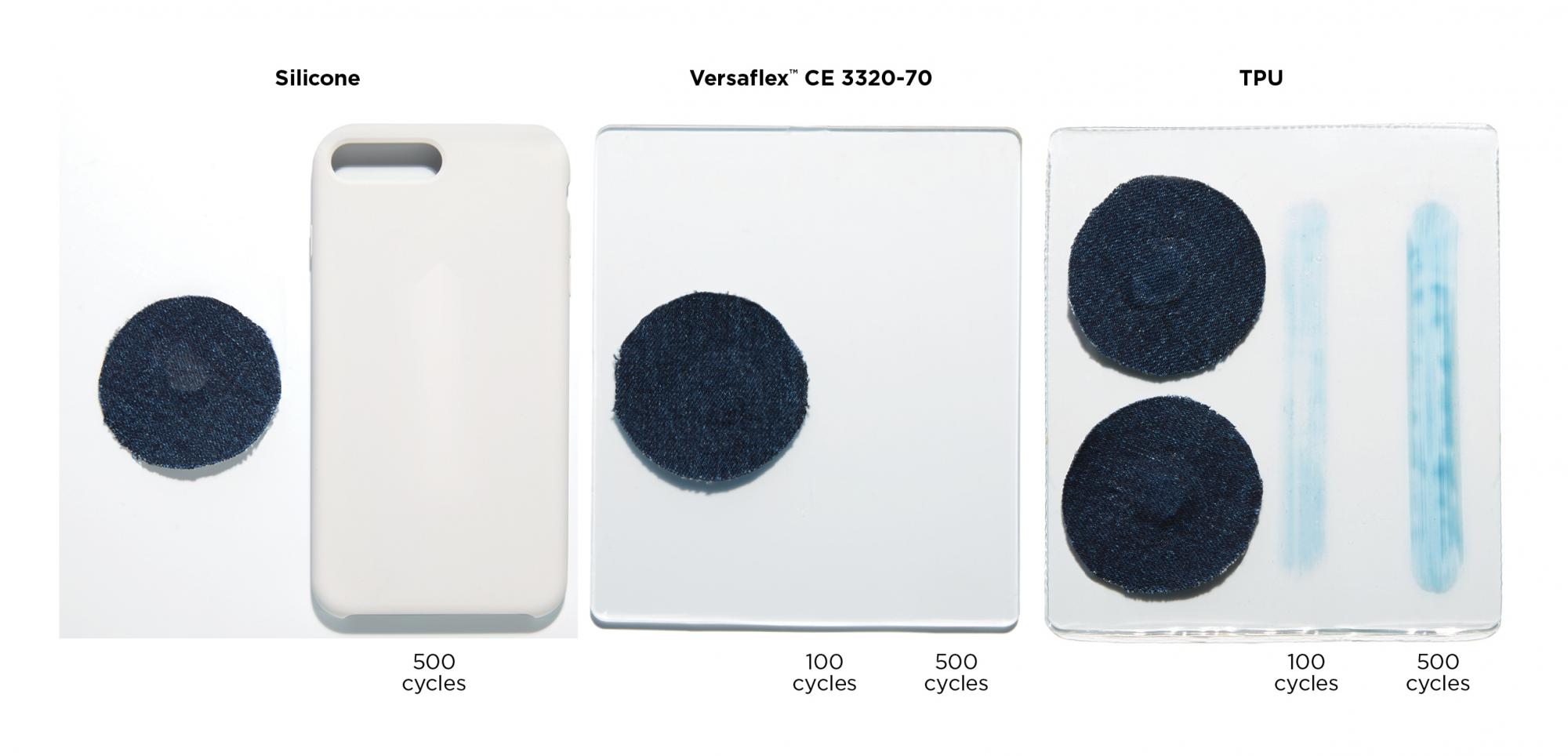 Caption: Comparison tests using the same methodology that measures blue jean staining on car seats show how new Versaflex™ CE 3320-70 performs versus silicone and TPU.