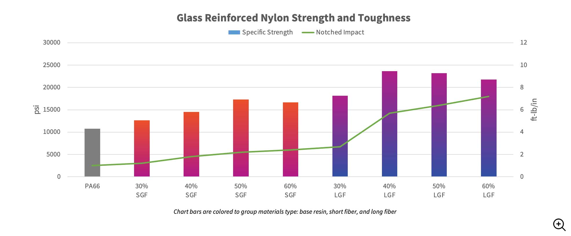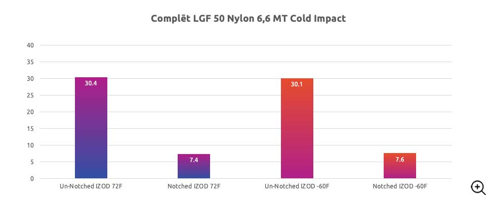 Reinforcing a thermoplastic with long glass fiber is a cost-effective way to boost mechanical properties of unreinforced resin systems and, even, short fiber solutions. It offers a noticeable improvement in stiffness and strength properties, but, more impressively, in impact strength. During processing these longer fibers intertwine and align to form an internal fiber skeleton that strengthens the polymer to help carry and dissipate stress forces – greatly increasing strength and impact resistance. This toughness is retained in demanding environments, such as cold temperatures (-60°F/-51°C).