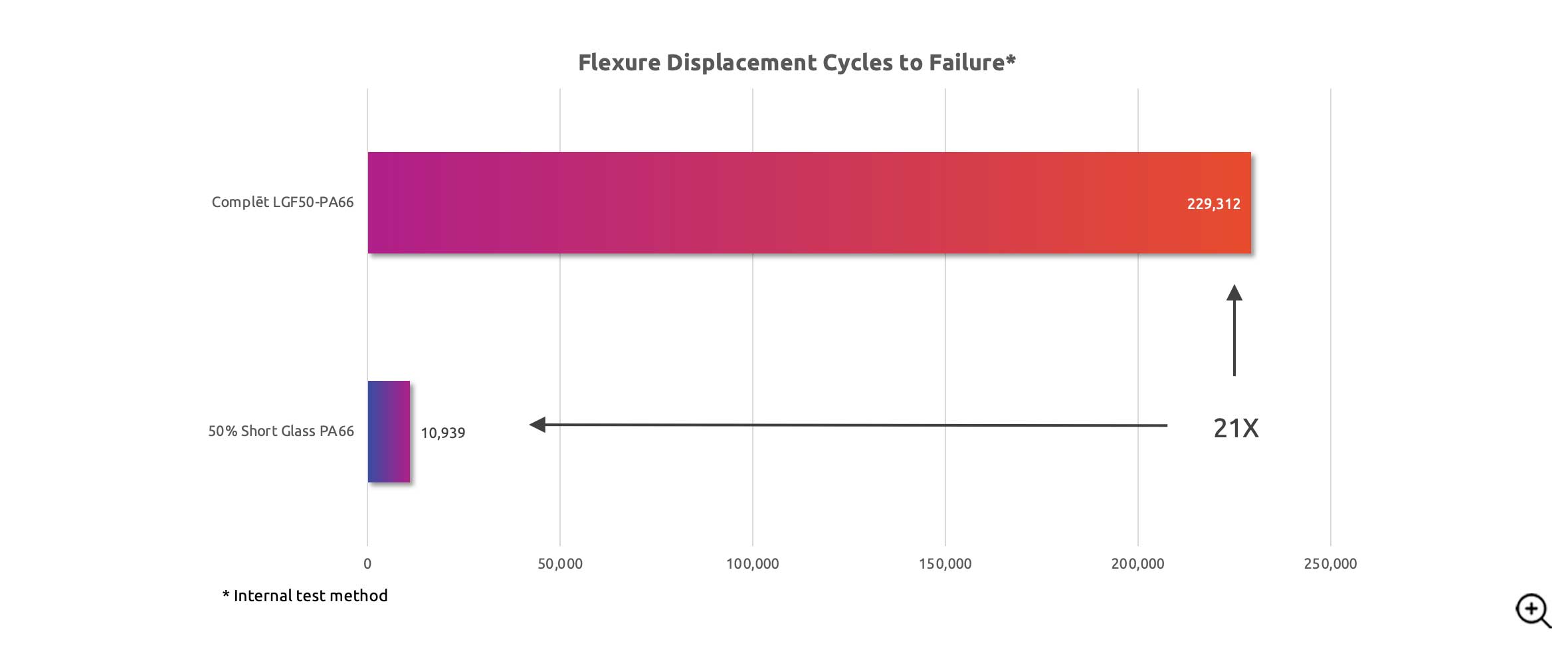 Long glass fiber composites start as continuous filaments of fiber, which we melt-impregnate with thermoplastic polymer in our pultrusion process to create a high performance bond. These unidirectional fiber-reinforced strands are then cut into 1/2 inch (12 mm) composite pellets for convenient processing into net shapes via injection molding. Higher aspect ratio fiber reinforcement through the full length of our pellets results in more robust properties than short/chopped glass fiber filled compounds. This also includes a significant jump in cyclical fatigue endurance and creep.
