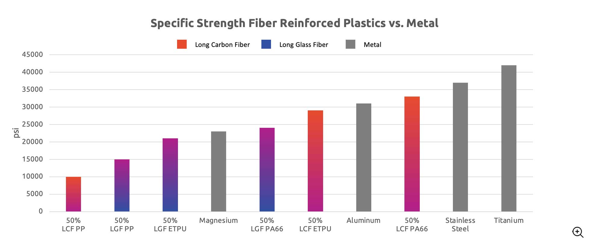 Long glass fiber is a strong yet ductile fiber reinforcement solution that is commonly used in metal replacement applications due to the high strength properties, lower specific gravity and attractiveness of the injection molding processing method. In conjunction with the advantages of organic design possibilities from the injection molding forming process, it is common to see a 40-50% weight reduction in applications when switching from metal incumbents (aluminum, magnesium). Part consolidation is also an area of benefit as well – eliminating the weight of fasteners and minimizing the risk of secondary assembly steps.