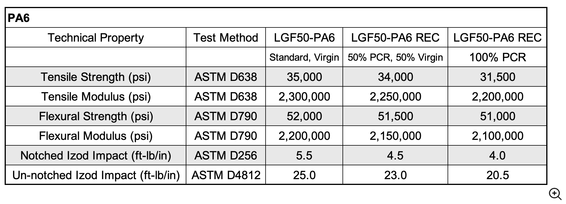 The Complēt™ REC portfolio consists of long fiber reinforced composites incorporating post-consumer recycled (PCR) nylon 6 resin, post-industrial recycled (PIR) nylon 66 resin, and PIR thermoplastic polyurethane (TPU) resin. The PCR content is derived from end-of-life fishing nets that could otherwise contribute to ocean plastic.